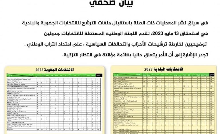 قدمت اللجنة الوطنية المستقلة للانتخابات، اليوم في بيان أصدرته، جدولين توضيحيين لخارطة ترشيحات الأحزاب والتحالفات السياسية، على امتداد التراب الوطني.