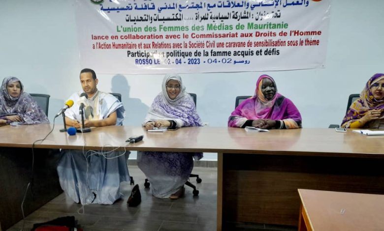 أطلق إتحاد إعلاميات موريتانيا قافلة تحسيسية الأحد،في روصو، جنوبي البلاد، حول المشاركة السياسية للمرأة، المكتسبات والتحديات، بالتعاون مع مفوضية حقوق الإنسان والعمل الإنساني والعلاقات مع المجتمع المدني .