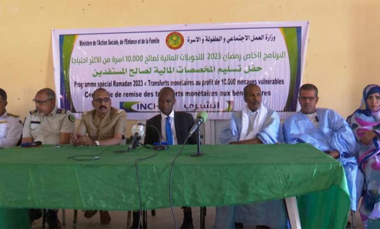 أشرف والي انشيري السيد ادريس دمبا كوريرا، اليوم الأربعاء من فضاء الشباب في اكجوجت، على عملية توزيع التحويلات النقدية لصالح 81 أسرة متعففة، بمعدل 5000 أوقية جديدة لكل أسرة، مقدمة من طرف وزارة العمل الاجتماعي والطفولة والأسرة في إطار البرنامج الخاص بشهر رمضان 2023.