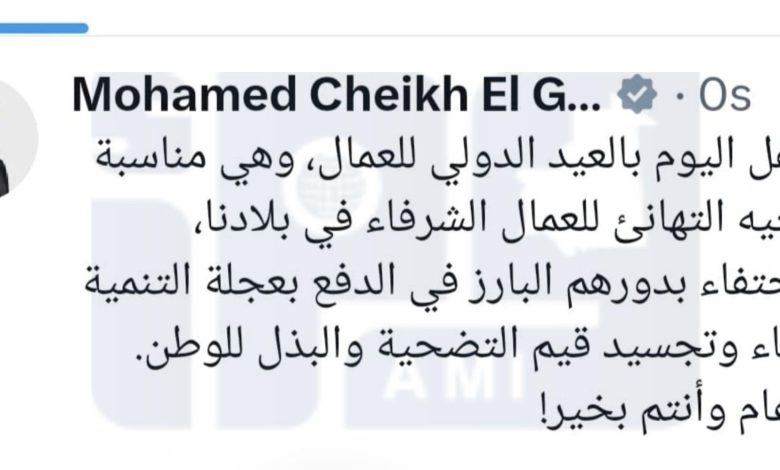 وجاء في تغريدة نشرها فخامته على حسابه بتويتر “نحتفل اليوم بالعيد الدولي للعمال، وهي مناسبة لتوجيه التهانئ للعمال الشرفاء في بلادنا، والاحتفاء بدورهم البارز في الدفع بعملية التنمية والبناء وتجسيد قيم التضحية والبذل للوطن.