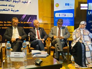 من جانبه المستشار الأول المكلف بالعلاقات الثقافية بالسفارة الإسبانية نيابة عن السفيرة الإسبانية المعتمدة في بلادنا، السيد خوسيه لورينثو أوتون، عبر عن سعادته بالمشاركة في هذا اللقاء المنظم بمناسبة اليوم العالمي لحرية الصحافة، منوها بالالتزام الكبير والرحلة الطويلة للوجود الإسباني في المشهد الثقافي الموريتاني وقال ممثل اليونسكو في الرباط السيد أريك فالت “إننا نحتفل بالذكرى الثلاثين لهذا اليوم الذي يتم الاحتفال به في جميع أنحاء العالم”، مُضيفا أن “مؤتمرنا الإقليمي هو جزء من احتفال عالمي ، في المنطقة المغاربية ولكن أيضًا في مائة دولة في إفريقيا وآسيا وأمريكا اللاتينية.