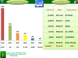 أصدرت السلطة العليا للصحافة والسمعيات البصرية مساء اليوم الجمعة نتائج عملية رصد التغطيات الإعلامية للحملة الانتخابية