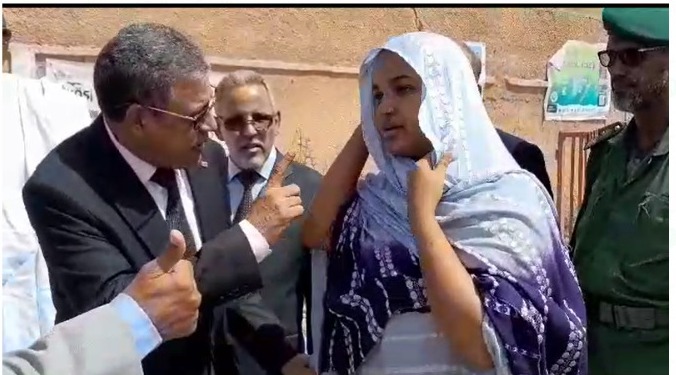 التمليذة بنت لبيظ صادفت الوزير خلال جولة مفاجئة قام بها اليوم لعدد من مراكز إجراء امتحانات الباكلوريا، وذلك بعيد وصوله إلى مركز ثانوية البنين رقم: 2 بمقاطعة لكصر في ولاية نواكشوط الغربية