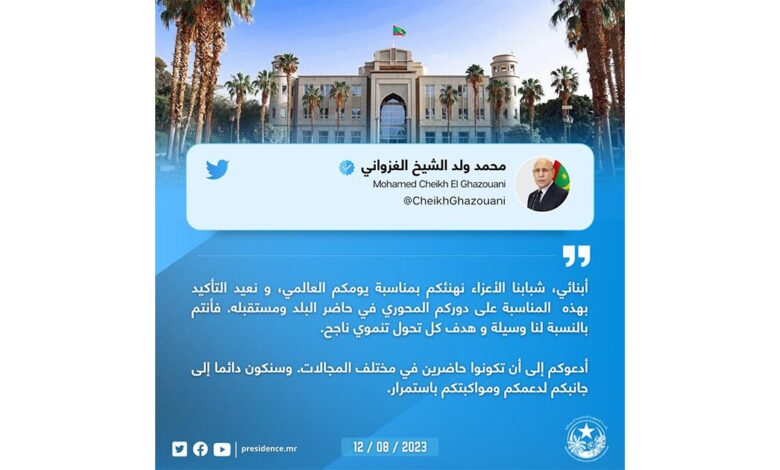 أكد فخامة رئيس الجمهورية، السيد محمد ولد الشيخ الغزواني، الدور المحوري للشباب في حاضر البلد ومستقله.