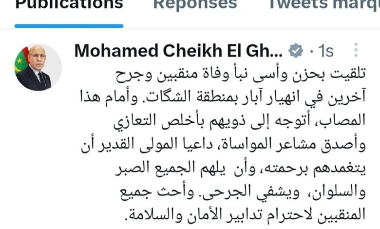 تلقيت بحزن وأسى نبأ وفاة منقبين وجرح آخرين في انهيار آبار بمنطقة الشگات. وأمام هذا المصاب، أتوجه إلى ذويهم بأخلص التعازي وأصدق مشاعر المواساة، داعيا المولى القدير أن يتغمدهم برحمته، وأن يلهم الجميع الصبر والسلوان، ويشفي الجرحى. وأحث جميع المنقبين لاحترام تدابير الأمان والسلامة.