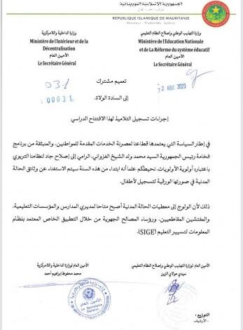 وأوضح التعميم أن هذا الإجراء يأتي “في إطار السياسة التي يعتمدها قطاعنا لعصرنة الخدمات المقدمة للمواطنين، والمنبثقة من برنامج فخامة رئيس الجمهورية السيد محمد ولد الشيخ الغزواني، الرامي إلى إصلاح جاد لنظامنا التربوي باعتباره أولوية الأولويات”