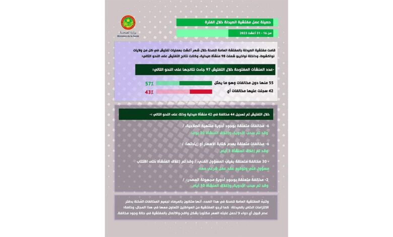 وبينت المفتشية أن حصيلة عملها خلال الفترة من 16 إلى 31 أغشت 2023 شملت تفتيش 98 منشأة صيدلية، في كل من ولايات نواكشوط، وداخلت انواذيبو.