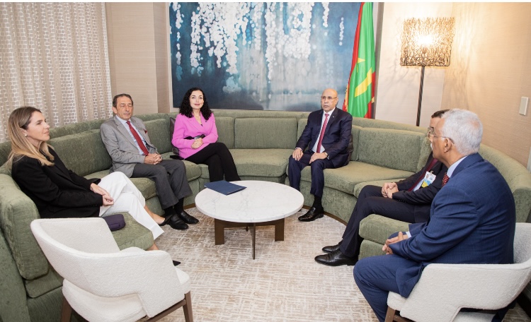 عقد فخامة رئيس الجمهورية، السيد محمد ولد الشيخ الغزواني، الأربعاء في مدينة نيويورك بالولايات المتحدة الأمريكية، جلسة مباحثات مع فيوسا عثماني، رئيسة كوسوفو، تناولت عدة قضايا تتعلق بالعلاقات الثنائية بين البلدين وسبل تطويرها وتعزيزها، بالإضافة إلى تطورات الوضع الاقليمي والدولي.