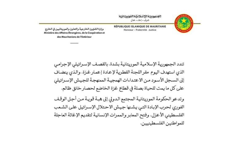 “تندد الجمهورية الإسلامية الموريتانية بشدة، بالقصف الإسرائيلي الإجرامي الذي استهدف اليوم مقر اللجنة القطرية لإعادة إعمار غزة، والذي ينضاف إلى السجل الأسود من الاعتداءات الهمجية الممنهجة للجيش الإسرائيلي على كل ما يمت للحياة بصلة في قطاع غزة الخاضع لحصار خانق ظالم.