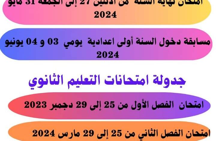 ووفق مقرر الوزارة, فإن امتحانات الفصل الأول من السنة الدراسية ستبدأ من” 25 إلى 29 “ديسمبر 2023، بينما ستبدأ امتحانات الفصل الثاني، من 25 إلى 29 مارس 2024، أما امتحان نهاية السنة فسيكون من 27 إلى 31 مايو 2024.