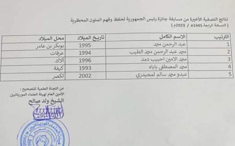 تعلن وزارة الشؤون الإسلامية والتعليم الأصلي نتائج التصفية الأخيرة من مسابقة جائزة رئيس الجمهورية لحفظ وفهم المتون المحظرية (النسخة الرابعة) حيث أفرزت 5 متسابقين وذلك وفقا للنتائج المرفقة.