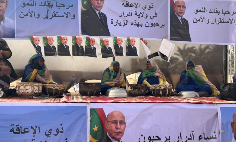 وقد نصب تيار انتصار غزواني منصة كبيرة على طريق المطار حملة لافتات ترحب باسم سكان ولاية آدرار بفخامة رئيس الجمهورية.