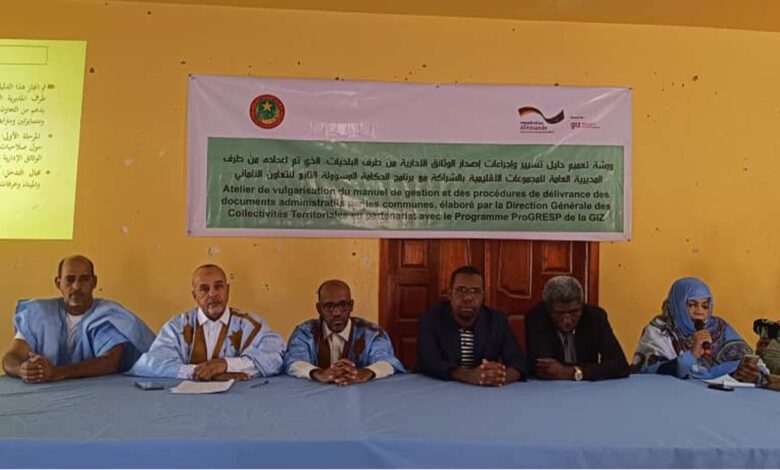أشرف والي آدرار المساعد، السيد سيداتي ولد القطب، صباح اليوم الأربعاء بدار الشباب في مقاطعة أطار، على افتتاح ورشة تعميم دليل تسيير وإجراءات إصدار الوثائق الإدارية، المنظمة من طرف برنامج الحكامة المسؤولة، التابع للتعاون الألماني، بالشراكة مع المديرية العامة للمجموعات الإقليمية، لصالح العمد المساعدين والأمناء العامين للبلديات، والمناديب الجهويين للامركزية والتنمية المحلية في ولايات (آدرار – انشيري – تيرس زمور – داخلت نواذيبو – تكانت).