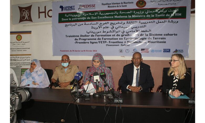 اشرفت معالي وزيرة الصحة السيدة الناها حمدي مكناس، اليوم الخميس في نواكشوط، على افتتاح ورشة العمل التدريبية الثالثة، المنظمة حول تخرج الدفعة السادسة من البرنامج التدريبي الميداني في علم الأوبئة للخط الأمامي بموريتانيا.