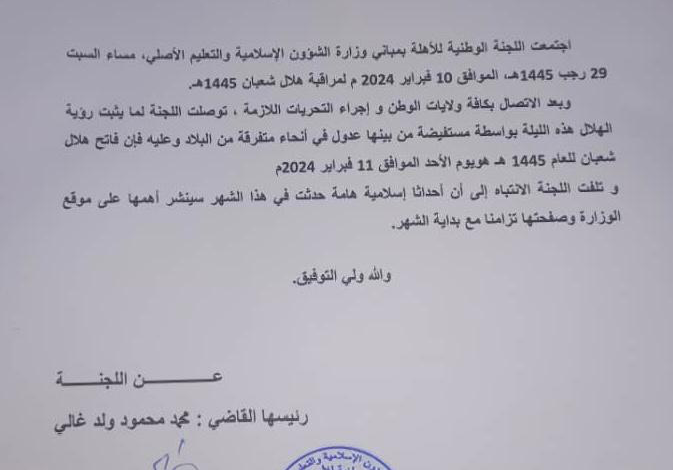أصدرت اللجنة الوطنية للأهلة بمباني وزارة الشؤون الإسلامية والتعليم الأصلي، بيانا مساء اليوم السبت 29 رجب 1445هـ، الموافق 10 فبراير 2024 م، أعلنت فيه توصلها لما يثبت رؤية الهلال هذه الليلة، بعد الاتصال بكافة ولايات الوطن و إجراء التحريات اللازمة.