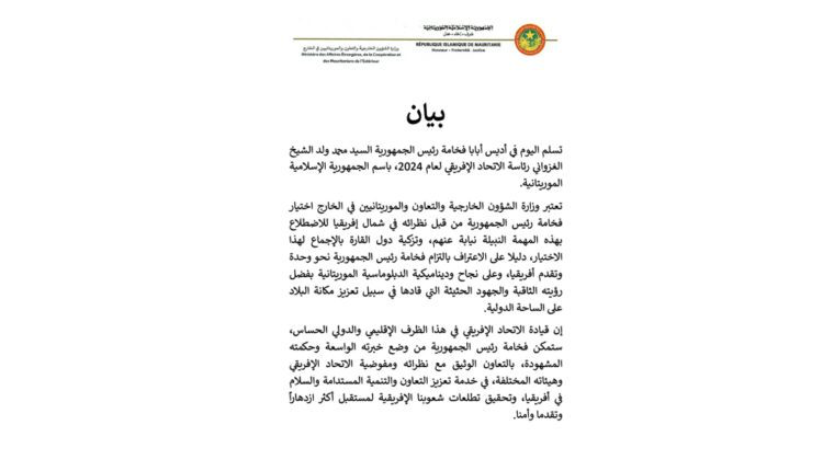 “تسلم اليوم في أديس أبابا فخامة رئيس الجمهورية السيد محمد ولد الشيخ الغزواني رئاسة الاتحاد الإفريقي لعام 2024، باسم الجمهورية الإسلامية الموريتانية.