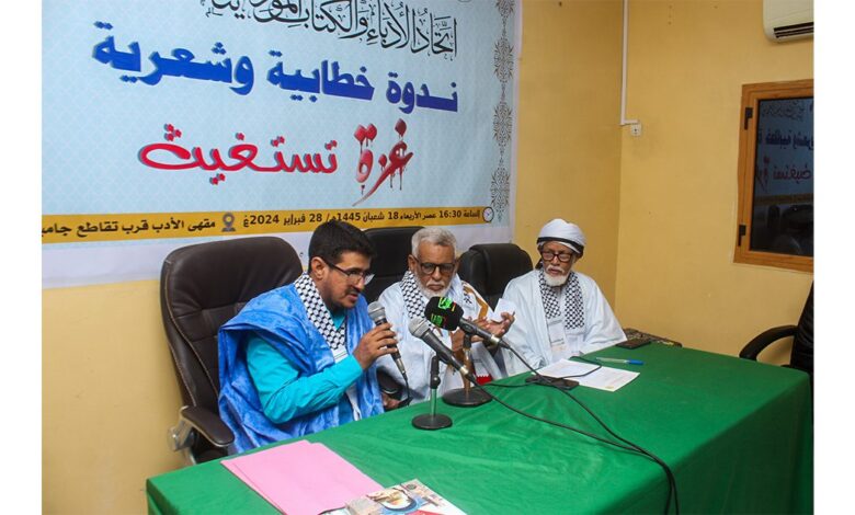نظم اتحاد الأدباء والكتاب الموريتانيين مساء الأربعاء في نواكشوط، ندوة خطابية وشعرية نصرة لفلسطين تحت شعار “غزة تستغيث”.