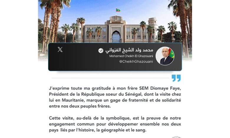 وكتب فخامته على حسابه في منصة (X): “أعرب عن بالغ امتناني لأخي صاحب الفخامة السيد باسيرو ديوماي فاي، رئيس جمهورية السنغال الشقيقة، الذي تمثل زيارته لموريتانيا ضمانا لتعزيز الأخوة والتضامن بن شعبيا الشقيقين.