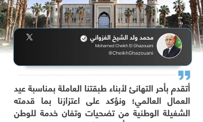 وكتب فخامته هنأ فخامة رئيس الجمهورية السيد محمد ولد الشيخ الغزواني، في تغريدة له اليوم، أبناء الطبقة العاملة بمناسبة عيد العمال العالمي.