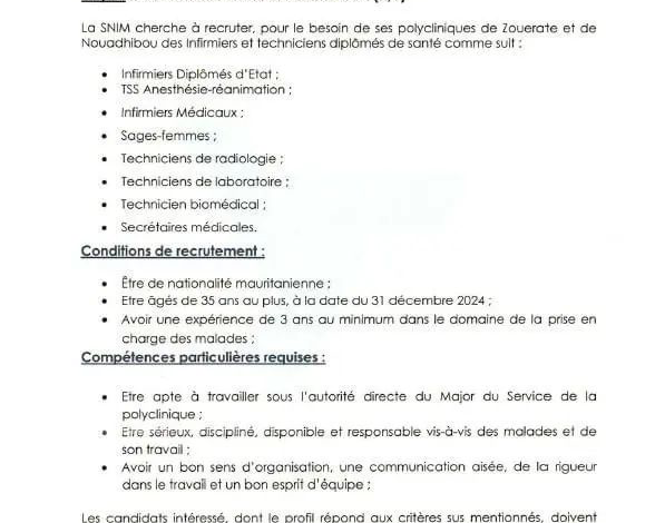نشرت الشركة الوطنية للصناعة والمناجم “سنيم” إعلانا أعربت فيه عن رغبتها اكتتاب موظفين صحيين، لصالح عياداتها في ازويرات ونواذيبو.