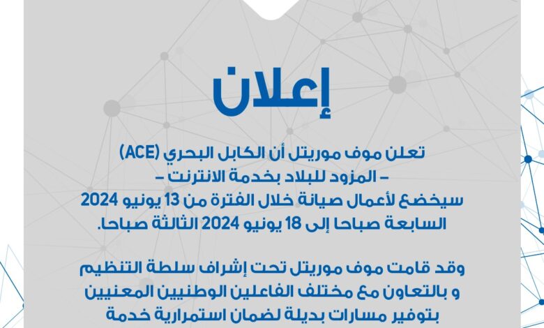 تعلن موف موريتل أن الكابل البحري (ACE) – المزود للبلاد بخدمة الانترنت- سيخضع لأعمال صيانة خلال الفترة من 13 يونيو 2024 السابعة صباحا إلى 18 يونيو 2024 الثالثة صباحا.