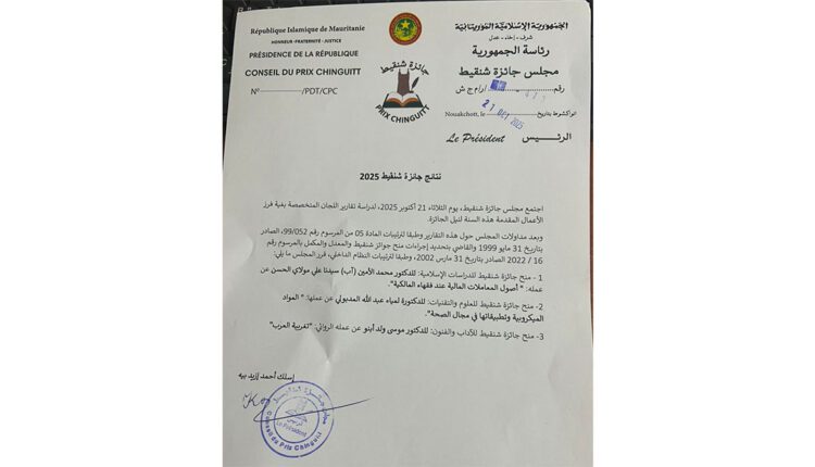 أعلن مجلس جائزة شنقيط اليوم الأربعاء أسماء الفائزين بالجائزة لسنة 2025.