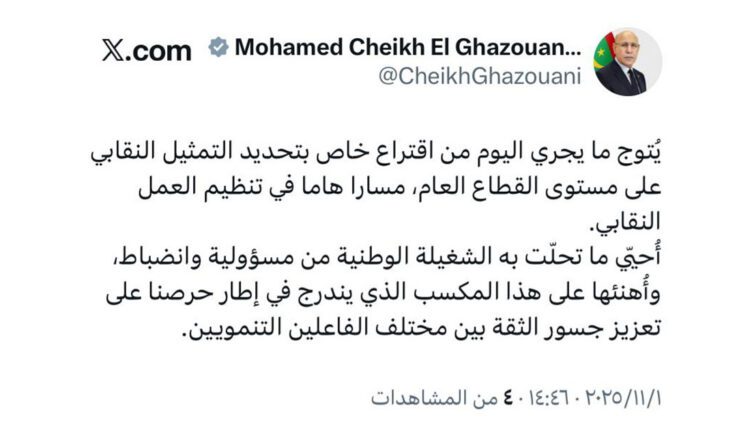 هنأ فخامة رئيس الجمهورية السيد محمد ولد الشيخ الغزواني، الشغيلة الوطنية، بمناسبة الاقتراع الخاص بتحديد التمثيل النقابي على مستوى القطاع العام.