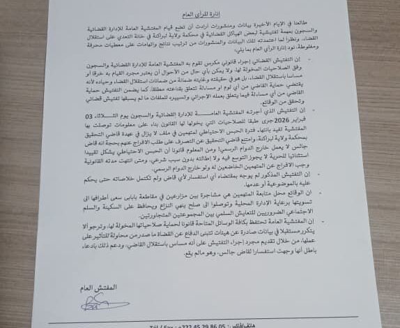 – إن المفتشية العامة تحتفظ بكافة الوسائل المتاحة قانونا لحماية صلاحياتها المخولة لها، وترجو ألا يتكرر مستقبلا في بيانات صادرة عن هيئات تتبنى الدفاع عن القضاة ما صدر من محاولة للتأثير على عملها، من خلال تقديم مجرد إجراء التفتيش على أنه مساس باستقلال القاضي، ودعم ذلك بادعاء باطل أنها وجهت استفسارا لقاض جالس، وهو مالم يقع.