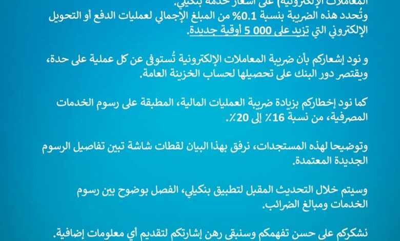 وأشار البيان إلى أن هذه الضريبة ستستوفى بشكل منفصل عن كل عملية، وأن دور البنك يقتصر على تحصيلها لصالح الخزينة العامة.